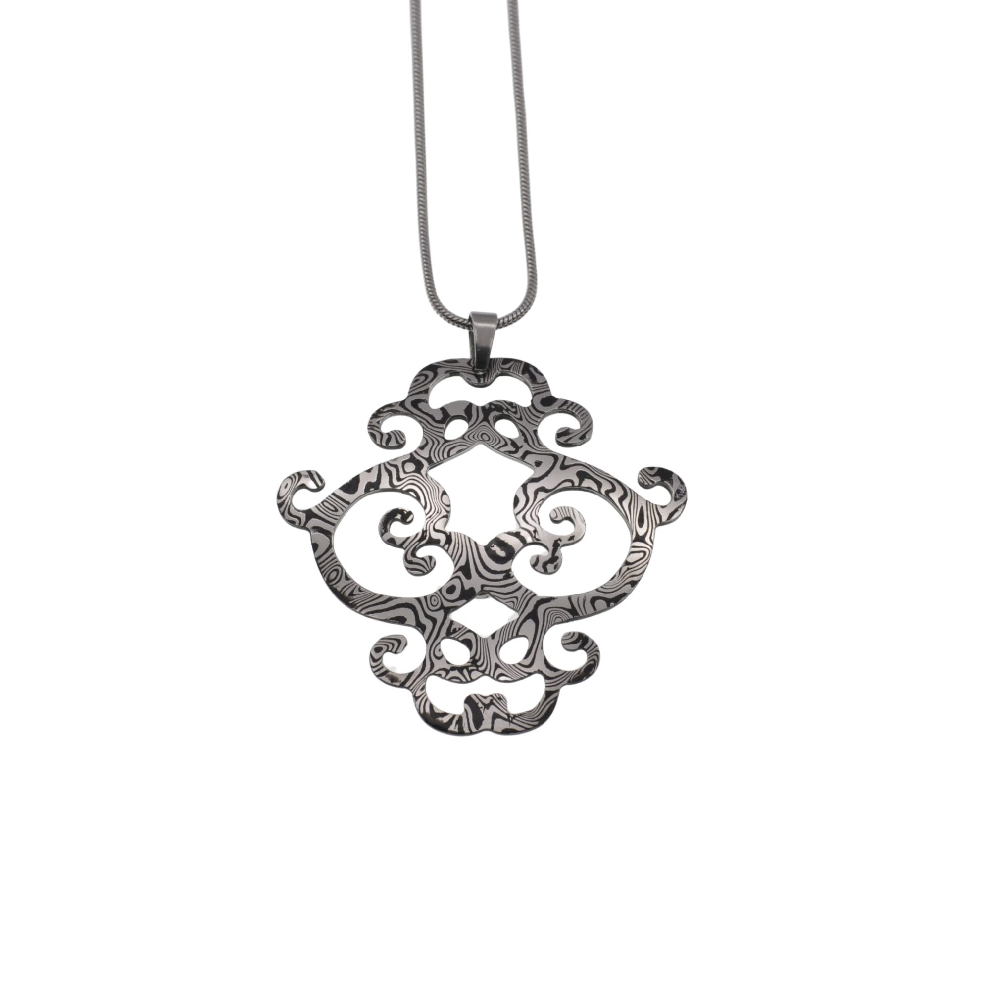Il pendente “Decoro Barocco” in acciaio Damasco unisce eleganza storica e audacia moderna. Forgiato a mano, ogni pezzo è unico nelle venature, anallergico, resistente nel tempo e simbolo di stile complesso e raffinato.