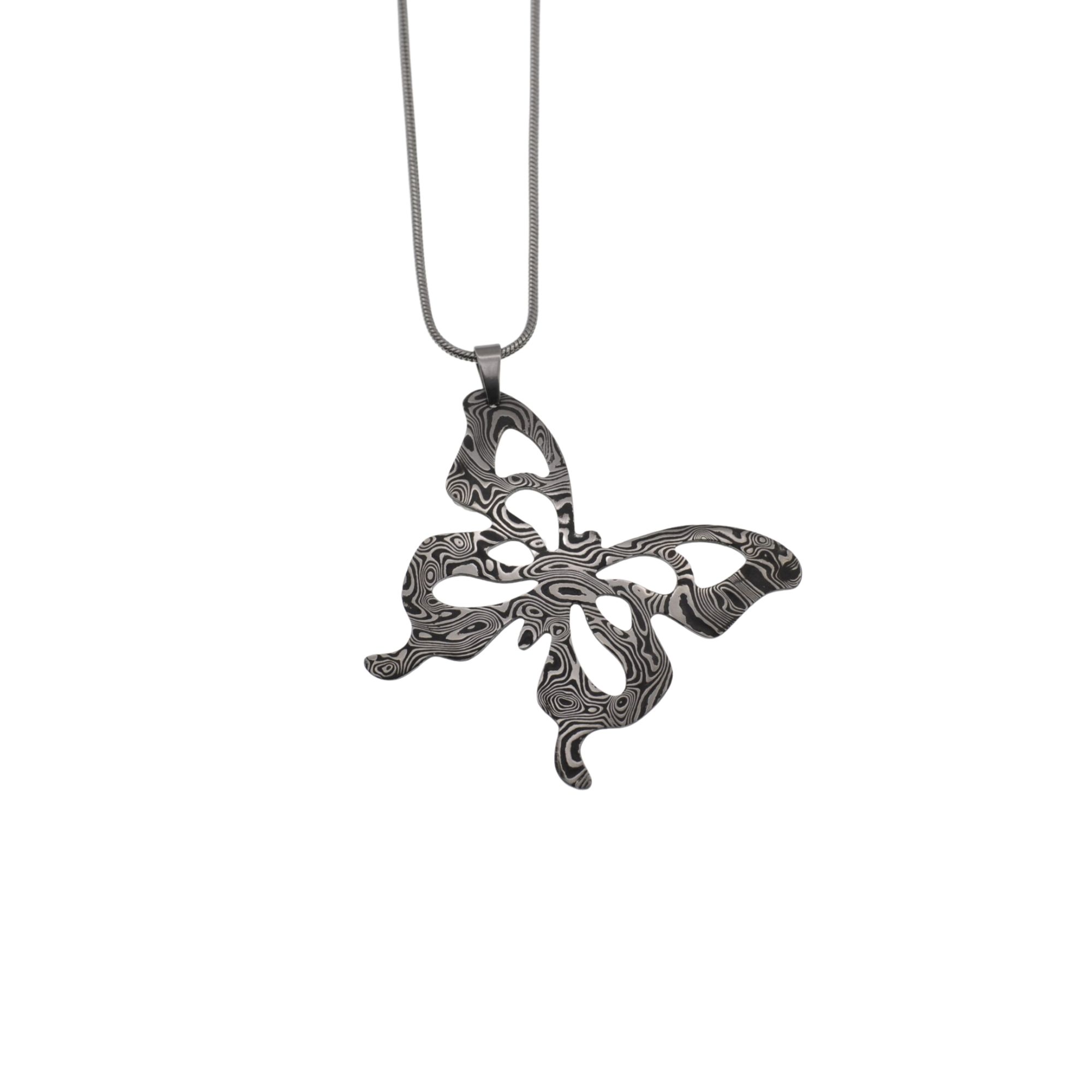 Il pendente “Farfalla” in acciaio Damasco simboleggia rinascita e leggerezza. Forgiato a mano, ogni pezzo è unico nelle venature, resistente nel tempo e un amuleto di trasformazione e gioia da indossare ogni giorno.