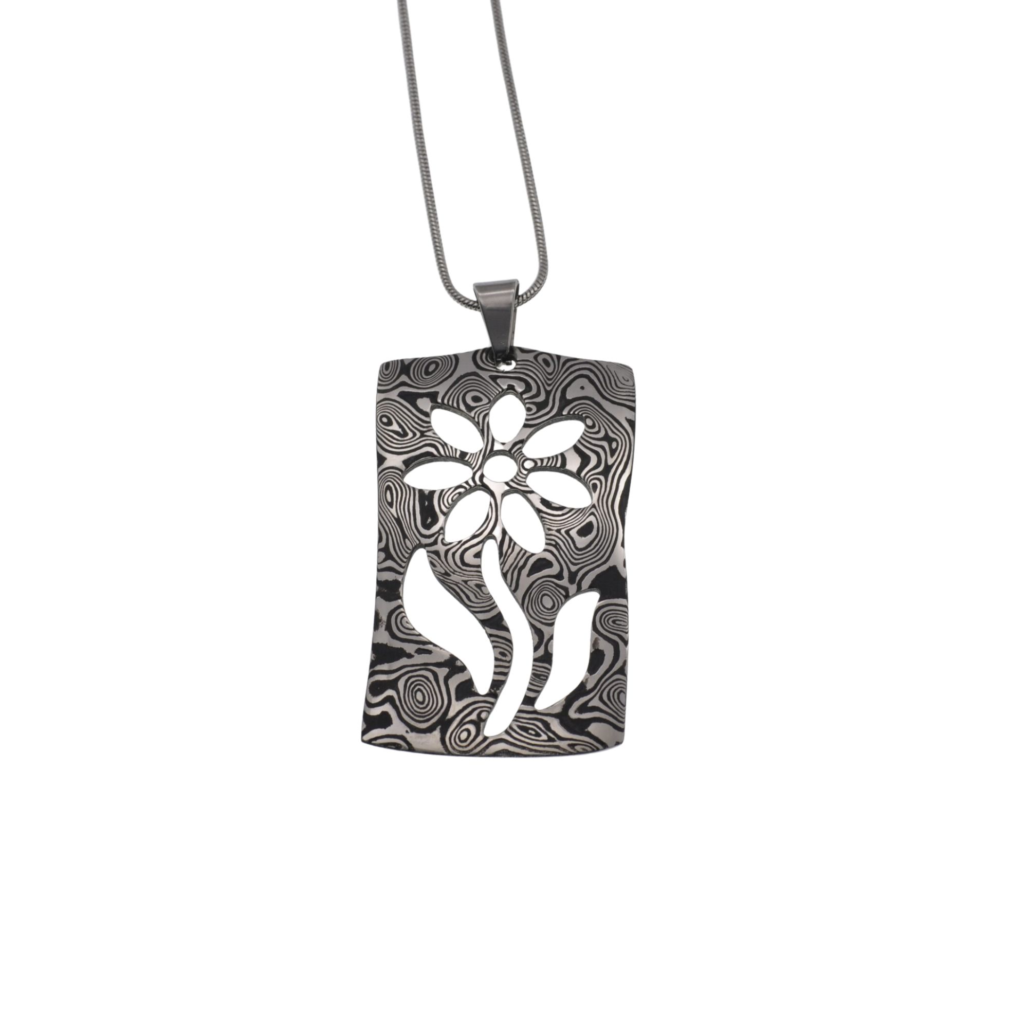 La sagoma rettangolare della piastra, con il fiore e il gambo traforati, crea un contrasto visivo d’impatto tra robustezza e leggerezza. L’acciaio Damasco, con il suo inconfondibile motivo a vortice e le sue texture uniche forgiate da strati di metallo, rendono ogni pendente irripetibile. La sua finitura resistente all’usura e al tempo, lo rende ideale per essere indossato ogni giorno.