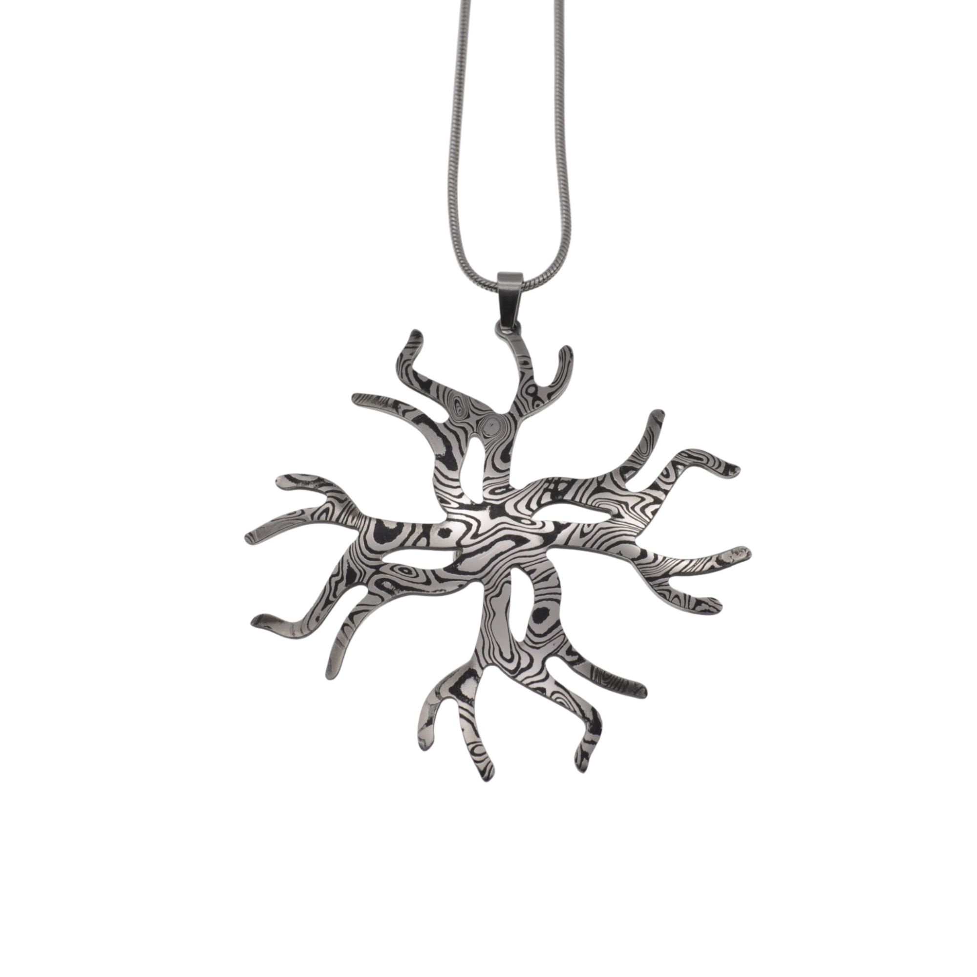 Il pendente “Corallo Quattro Rami” in acciaio Damasco cattura forza e vitalità del mare. Forgiato a mano, ogni pezzo è unico nelle venature, resistente nel tempo e dona un tocco di eleganza distintiva.