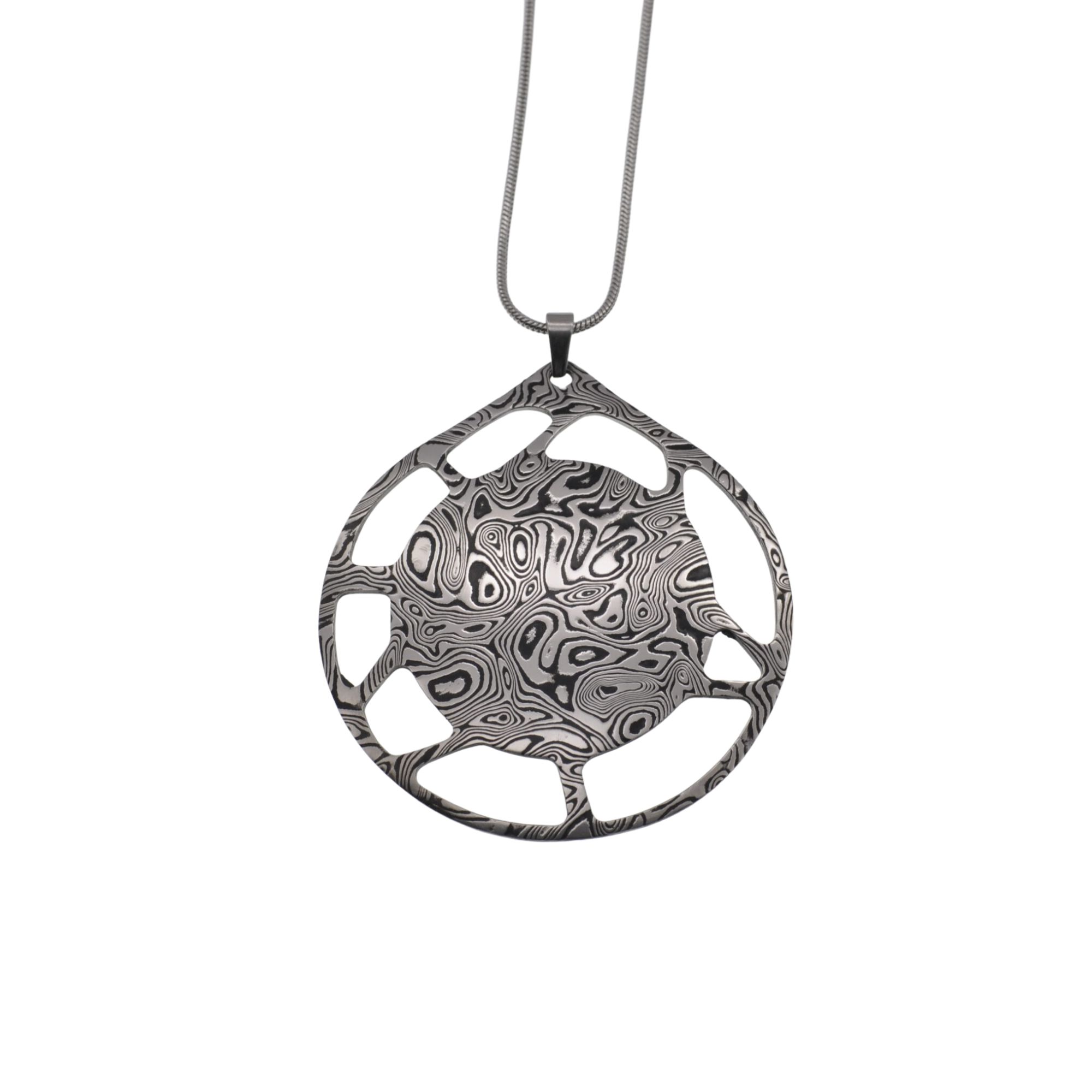 Il pendente “Tondo con cornice traforata” in acciaio Damasco esprime armonia e ciclicità con il suo design geometrico e contemporaneo. Forgiato a mano, ogni pezzo è unico nelle venature, anallergico e resistente nel tempo è simbolo di equilibrio interiore.