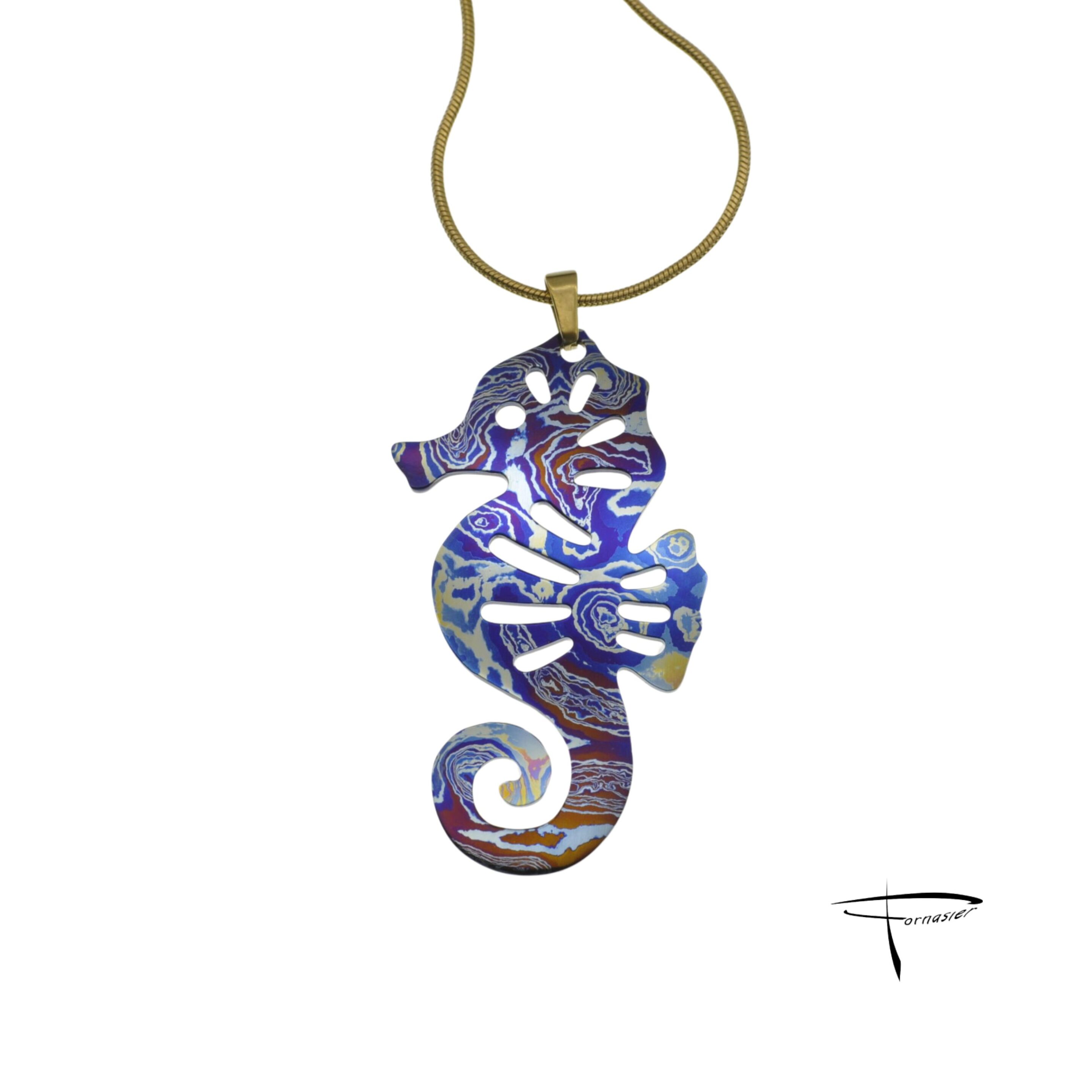 Il pendente Cavalluccio Marino simbolo di grazia e armonia, è realizzato a mano in autentico damasco di titanio e colorato con sfumature marine di blu e verde, che evocano la quiete delle profondità oceaniche e la delicatezza dei movimenti del mare.