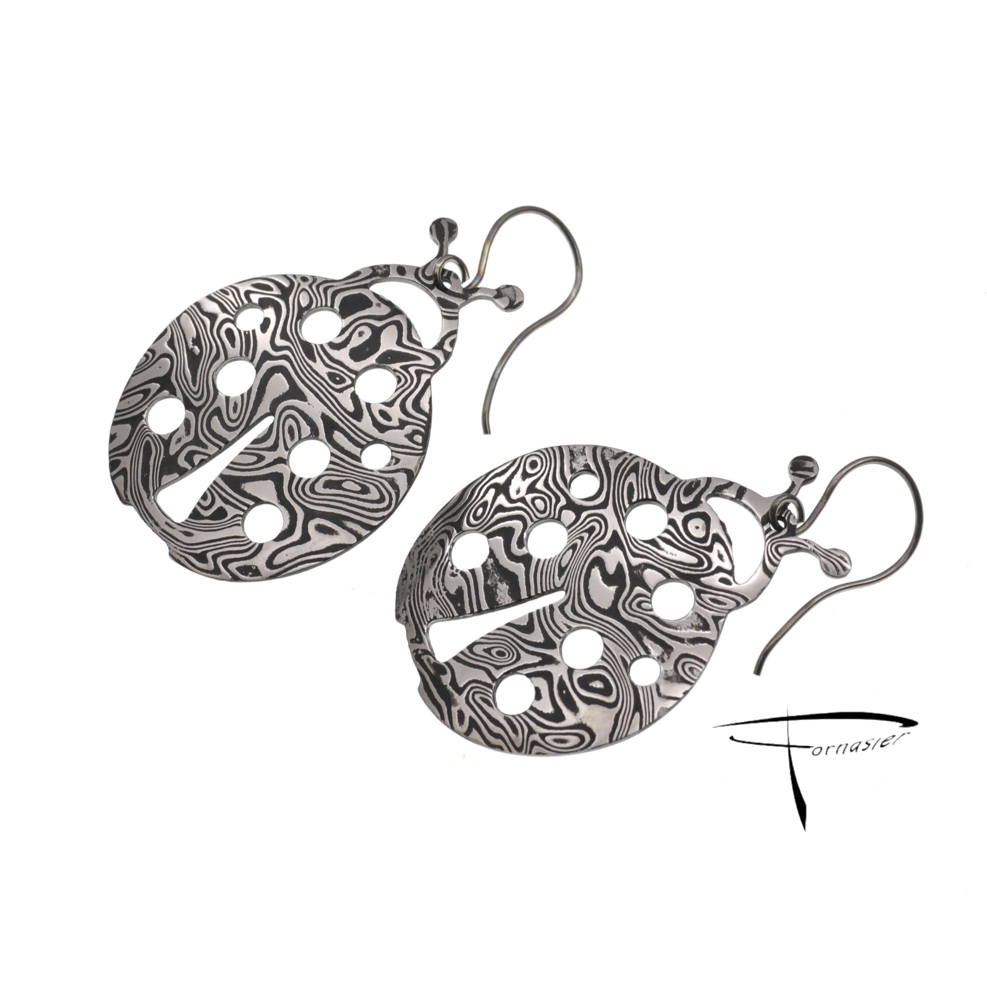 Gli orecchini “Coccinelle” in acciaio Damasco uniscono leggerezza e forza. Forgiati a mano, ogni pezzo è unico nelle venature, resistente nel tempo, anallergici. Simbolo di fortuna, grazia e bellezza autentica da indossare ogni giorno.