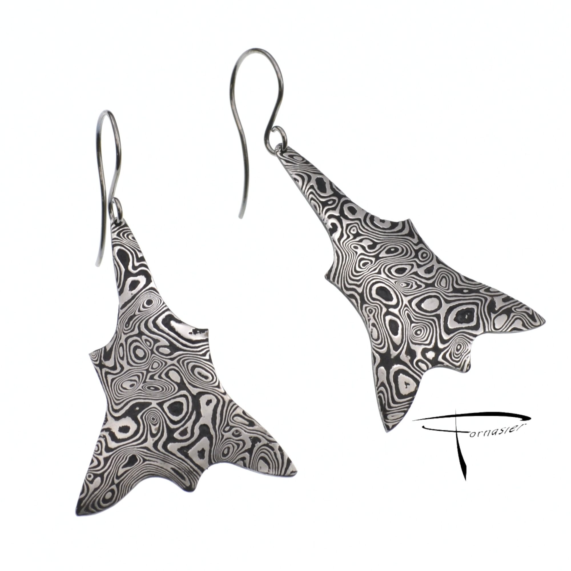 Orecchini realizzati a mano in autentico damasco di acciaio inossidabile. Caratterizzati da linee pulite e trame metalliche uniche, uniscono la resistenza delle leghe AISI 316L e 420B a un’estetica moderna e raffinata.