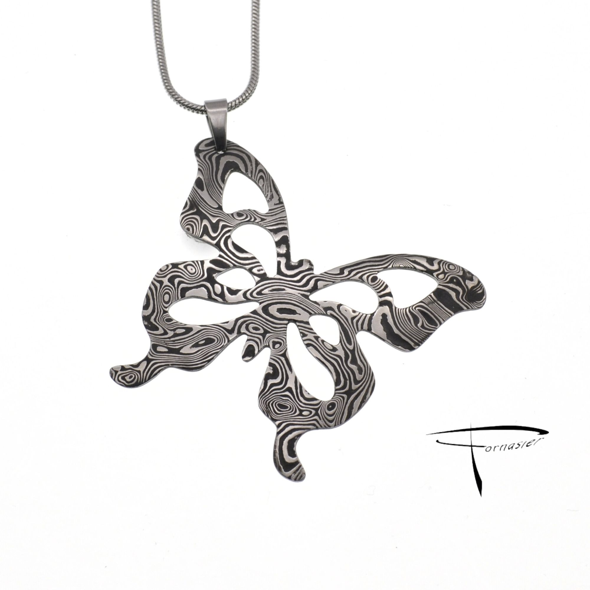 Il pendente “Farfalla” in acciaio Damasco simboleggia rinascita e leggerezza. Forgiato a mano, ogni pezzo è unico nelle venature, resistente nel tempo e un amuleto di trasformazione e gioia da indossare ogni giorno.