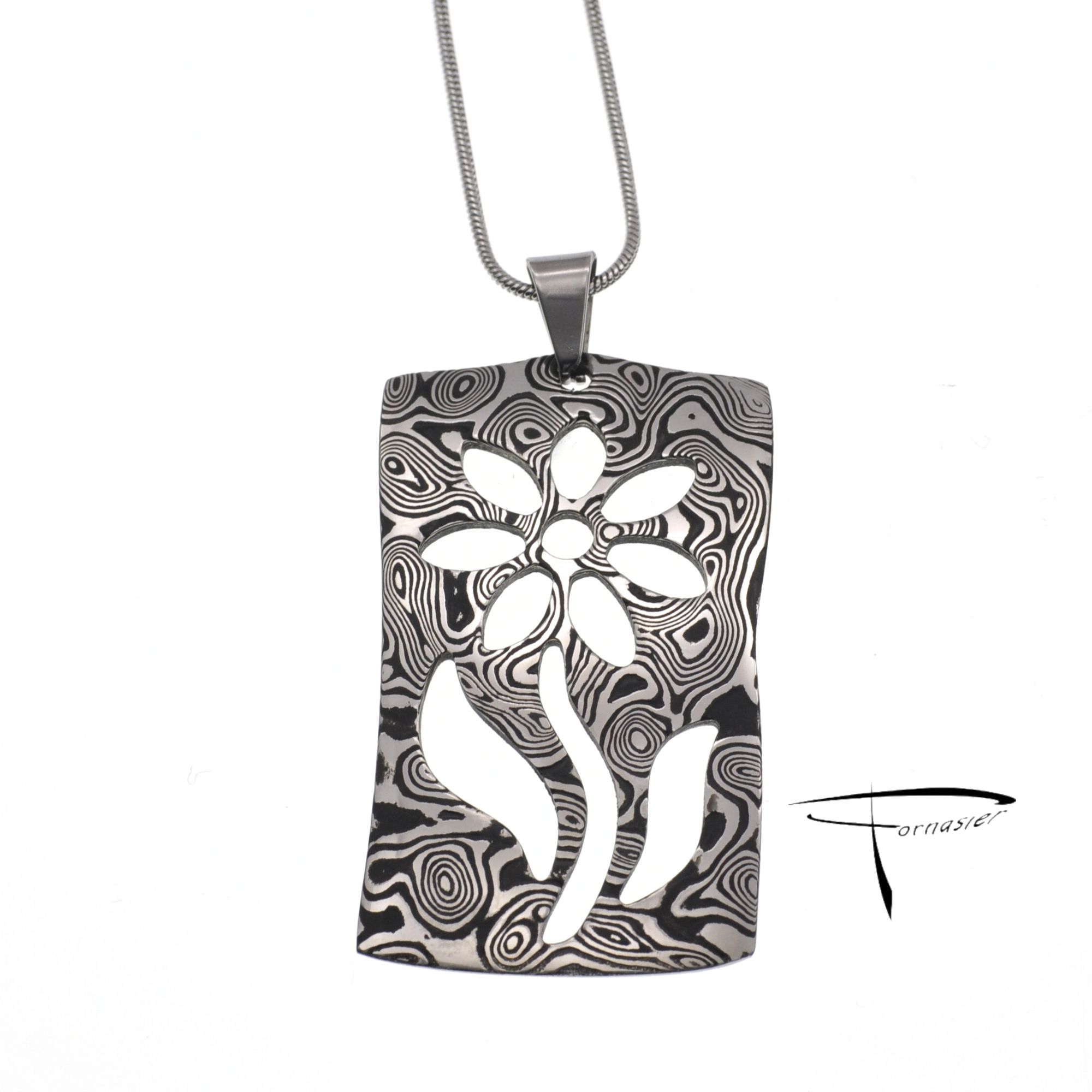 La sagoma rettangolare della piastra, con il fiore e il gambo traforati, crea un contrasto visivo d’impatto tra robustezza e leggerezza. L’acciaio Damasco, con il suo inconfondibile motivo a vortice e le sue texture uniche forgiate da strati di metallo, rendono ogni pendente irripetibile. La sua finitura resistente all’usura e al tempo, lo rende ideale per essere indossato ogni giorno.