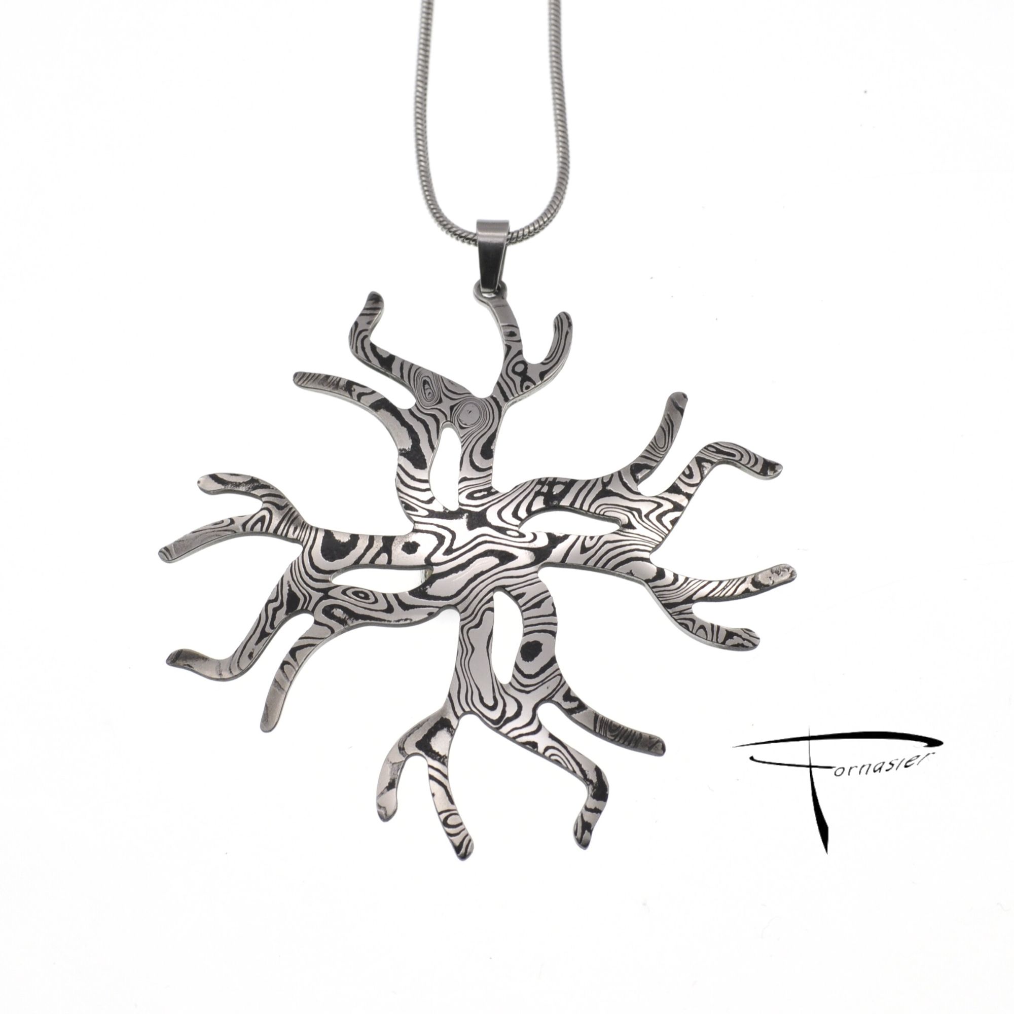 Il pendente “Corallo Quattro Rami” in acciaio Damasco cattura forza e vitalità del mare. Forgiato a mano, ogni pezzo è unico nelle venature, resistente nel tempo e dona un tocco di eleganza distintiva.