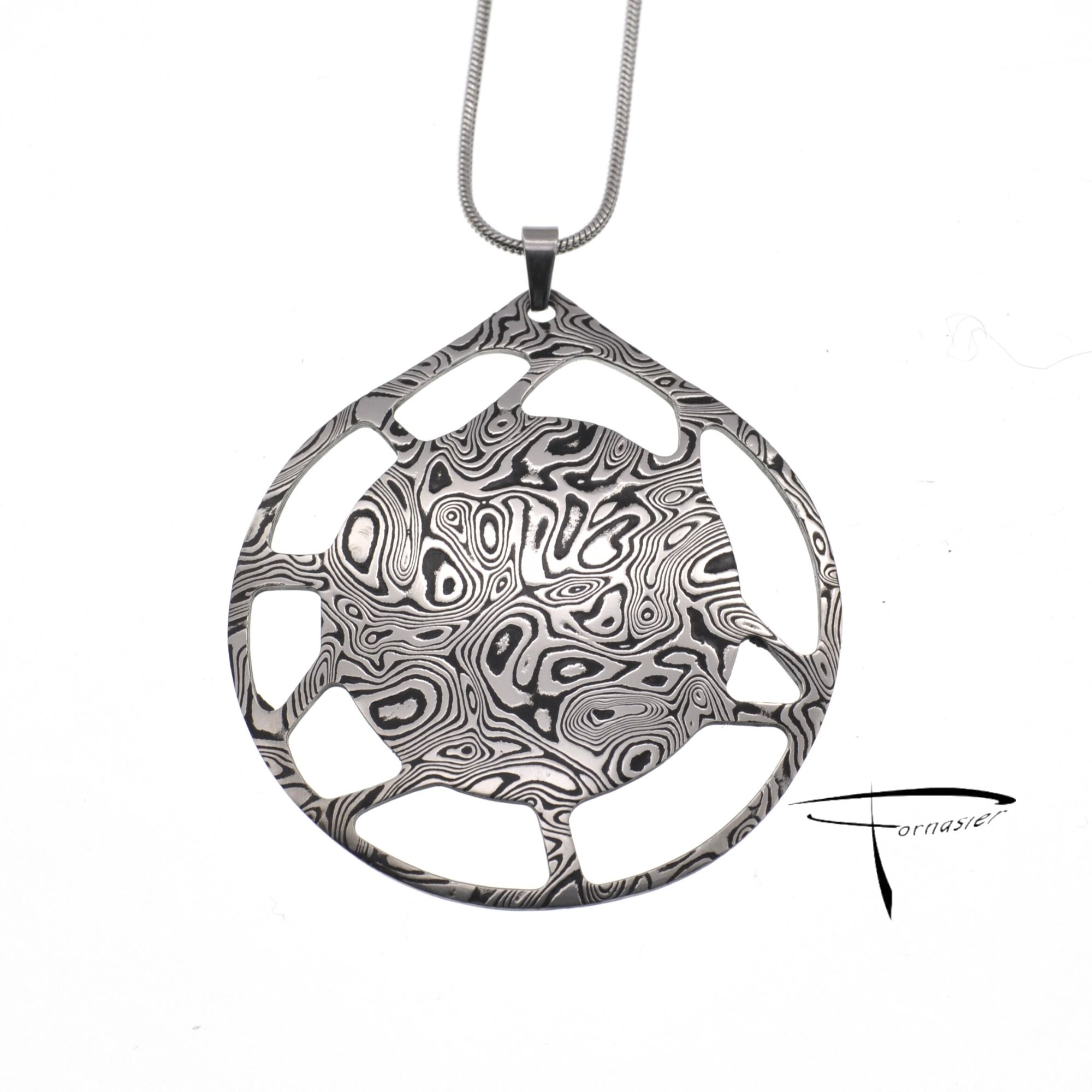 Il pendente “Tondo con cornice traforata” in acciaio Damasco esprime armonia e ciclicità con il suo design geometrico e contemporaneo. Forgiato a mano, ogni pezzo è unico nelle venature, anallergico e resistente nel tempo è simbolo di equilibrio interiore.